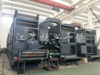 該汙泥專用帶式幹燥設備共三套,設備包含了幹燥主機、熱風循環(huán)係統、輸送係(xì)統、傳動係統、排濕係統、控製係統等。本設備自動化程度高,每單(dān)元循環風量、循環風溫(wēn)度、排濕量,及帶運行速(sù)度均可獨立調節,生產過程不需人工幹預。箱底設計有落料斜板及快開清掃門,便於清理箱內粉料,物(wù)料在幹燥過程中自(zì)動翻料,保證了物料(liào)的均(jun1)勻(yún)度,杜絕了汙染物的帶入。采(cǎi)用熱風循環的方式,能耗低,熱利用率較高,可適應不同物料的幹燥脫水。