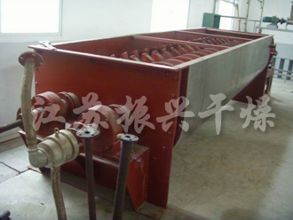 在漿葉及夾套通入蒸汽加熱(rè)的同時,出(chū)料口上部同時通入經過加熱後的幹空氣進一(yī)步幹燥,這樣大大增加了設備的幹燥強度。蒸發出來的水分由尾氣(qì)帶出幹(gàn)燥機,經過(guò)布袋除(chú)塵器過濾,將幹燥後的細(xì)粉回收(shōu)下來,濕空氣由水除塵後引風機排出室外(wài)。